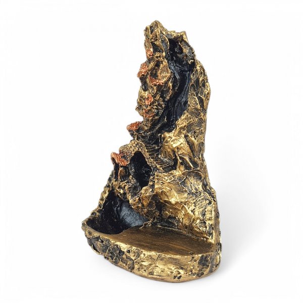 Acenda a ponta do cone cascata, aguarde formar a brasa e posicione no incensário. A fumaça desce pelo caminho interno, criando o efeito cascata.